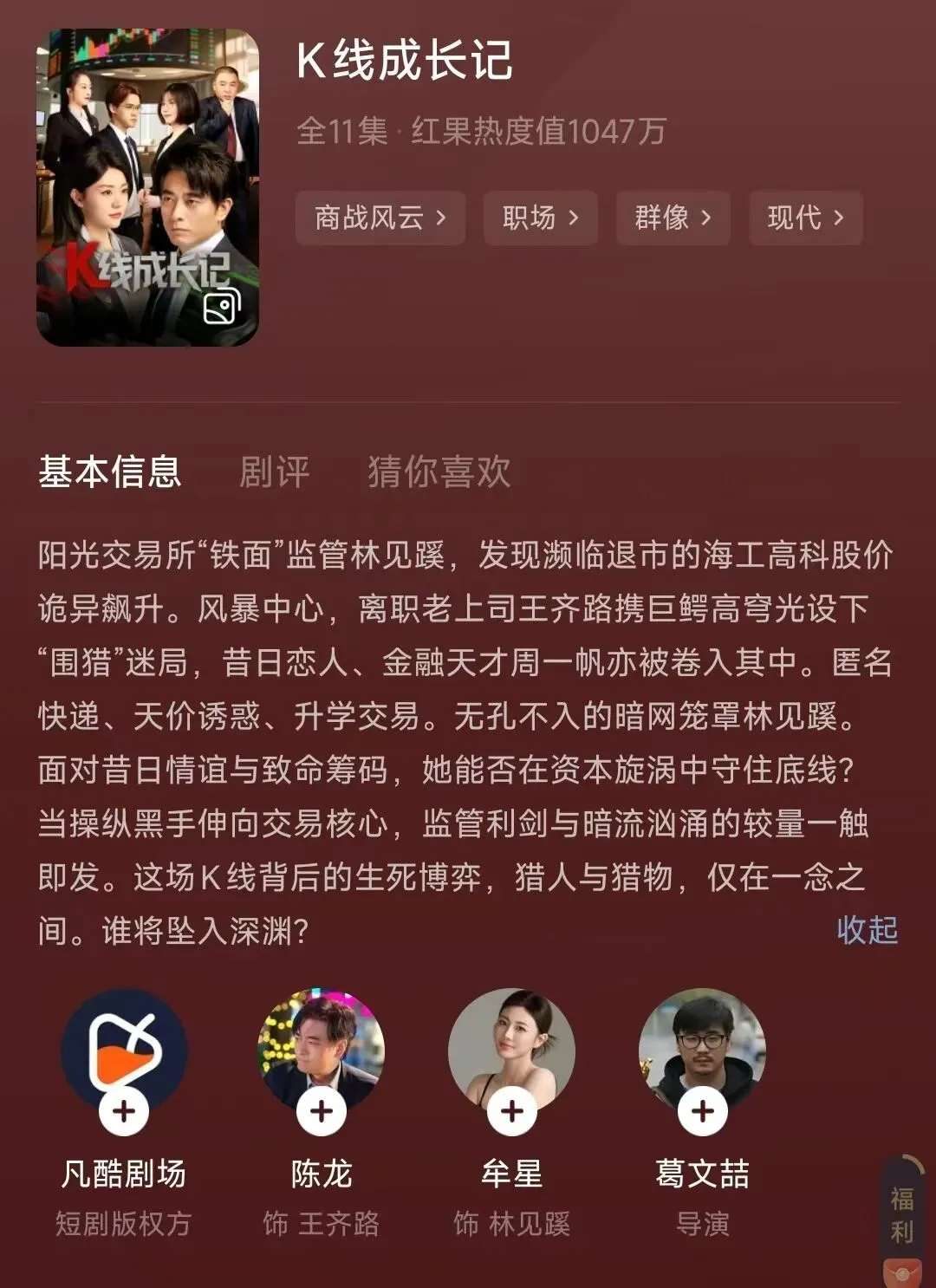 这对金融行业的职场搭档,完全把金融从业者的专业和默契都演到了骨子里,而短剧《K线成长记》是北交所的出品,演员牟星,王莹都是实打实的实力派,搜名字就能看到超多相关剧情片段,真实又有代入感