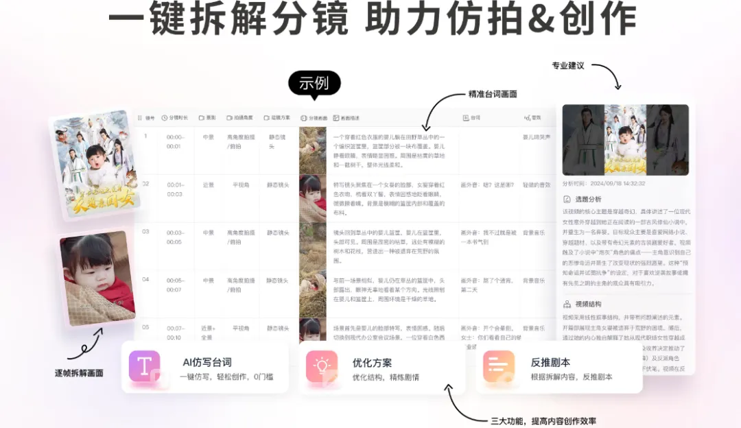 AI拆短片作为高效的 AI拉片工具,可以实现“秒级拆解+精准还原”,不仅能提取出每个分镜头的首尾帧、画面描述、台词等,甚至可以反推为标准的短剧剧本。例如短剧编剧想学习《盛夏芬德拉》这部爆款剧,播出量破 30 亿的剧,只需上传视频,便能迅速输出分镜脚本等,让编剧们看到“爆款前 3 秒的镜头衔接”“第 8 分钟的付费点设计”“台词的情绪递进逻辑”等。