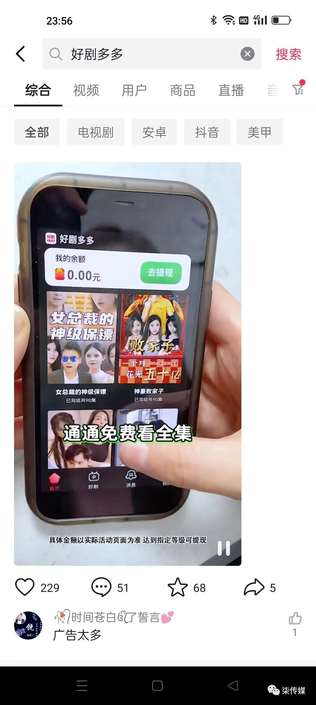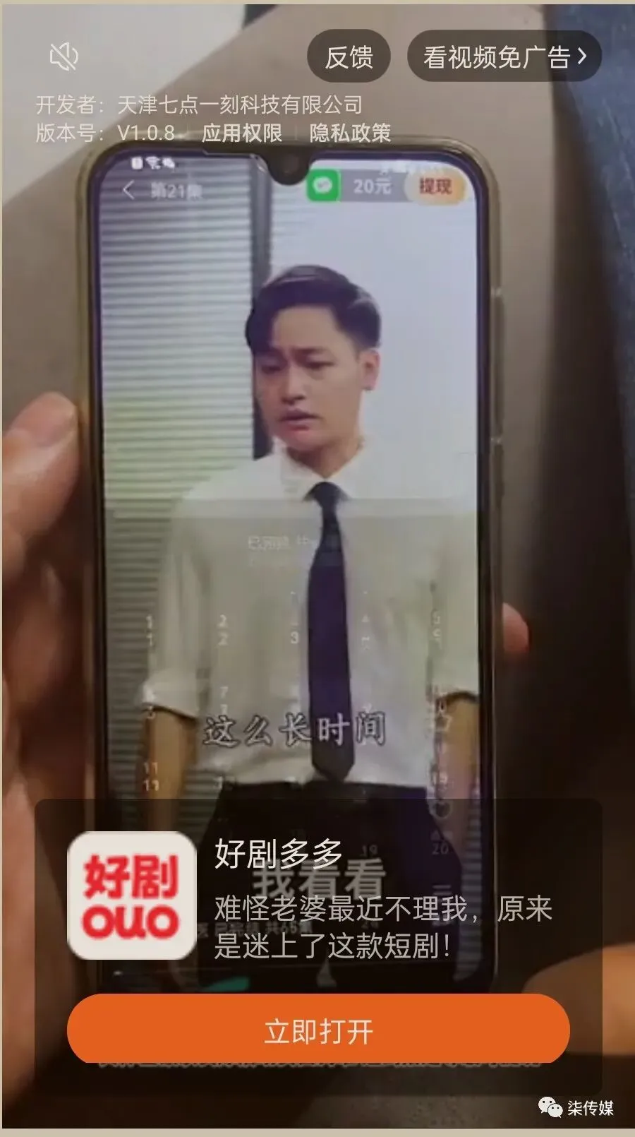 这些公司大多数是老牌的网赚或者轻游戏公司。熟悉投流圈或者你是做信息流2年以上的大多应该对于这些公司不陌生。嗯嗯,就是羊了个羊模式,相比较我们小程序短剧主要载体是小程序等来说,他们主要是以APP来承载。运营方式也是推流获量,缺点是广告比较多。在政策管控的影响下,APP短剧是一次尝试,或者说是一次曲线救国的不得已的探索。方式还需要去看效果和roi相比小程序短剧的胜负!