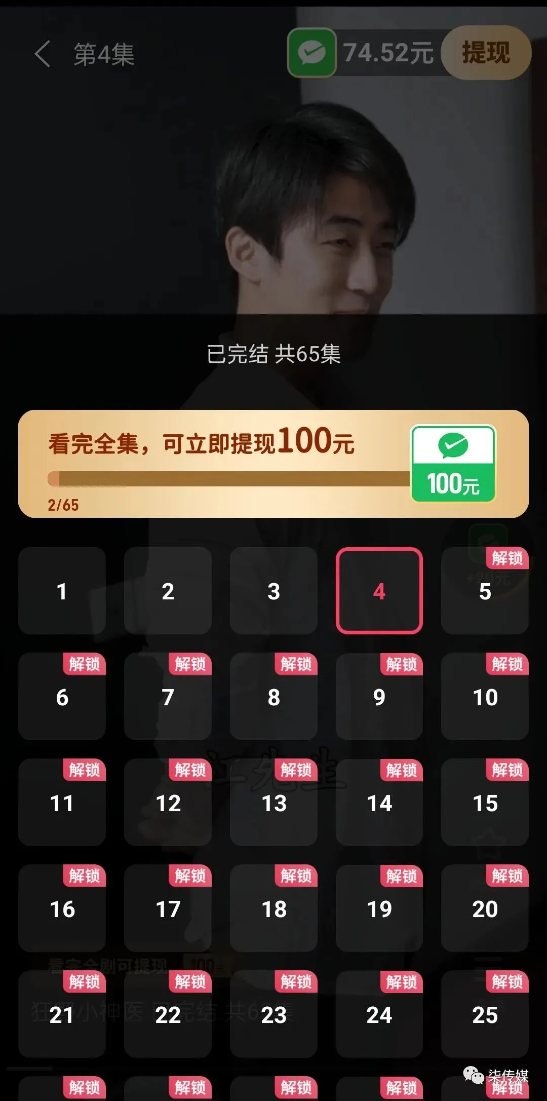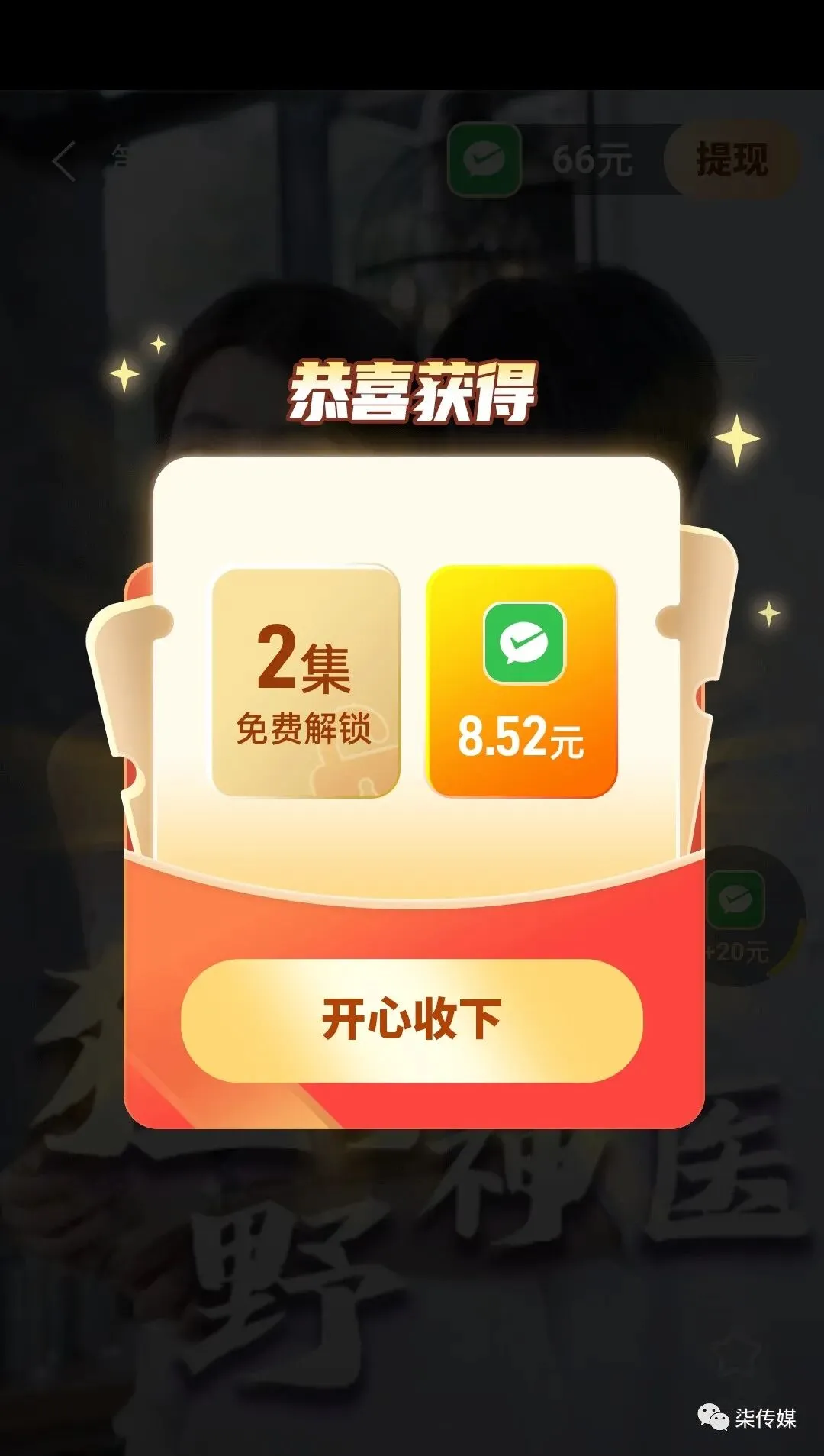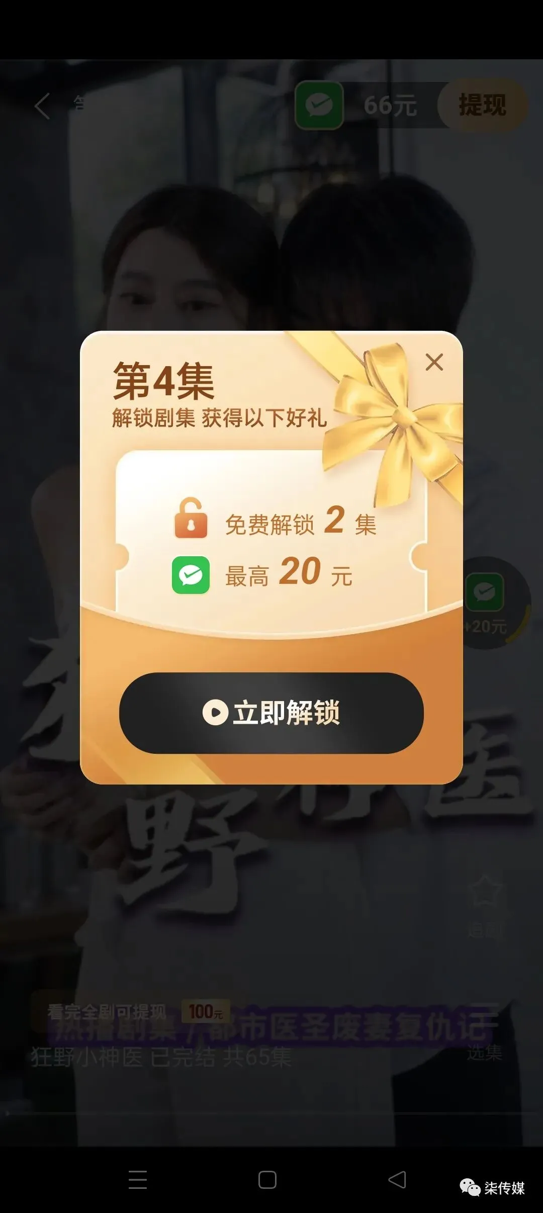 我看的是一部叫狂神小神医的短剧,当看到第四集的时候,提示需要解锁。于是我就看了一段广告解锁,广告是穿山甲广告。广告看完提示我可以解锁两集短剧。