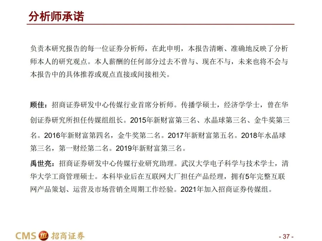 禹世亮:招商证券研发中心传媒行业研究助理。武汉大学电子科学与技术学士,清华大学工商管理硕士。本科毕业后在互联网大厂担任产品经理,拥有5年完整互联网产品策划、运营及市场营销全周期工作经验。2021年加入招商证券传媒组。
