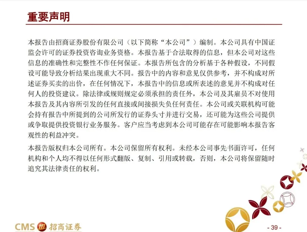 本报告由招商证券股份有限公司(以下简称“本公司”)编制。本公司具有中国证监会许可的证券投资咨询业务资格。本报告基于合法取得的信息,但本公司对这些信息的准确性和完整性不作任何保证。本报告所包含的分析基于各种假设,不同假设可能导致分析结果出现重大不同。报告中的内容和意见仅供参考,并不构成对所述证券买卖的出价,在任何情况下,本报告中的信息或所表述的意见并不构成对任何人的投资建议。除法律或规则规定必须承担的责任外,本公司及其雇员不对使用本报告及其内容所引发的任何直接或间接损失负任何责任。本公司或关联机构可能会持有报告中所提到的公司所发行的证券头寸并进行交易,还可能为这些公司提供或争取提供投资银行业务服务。客户应当考虑到本公司可能存在可能影响本报告客观性的利益冲突。
