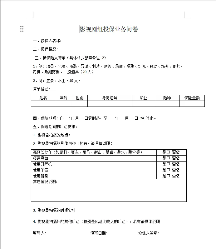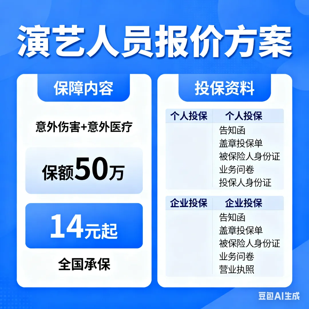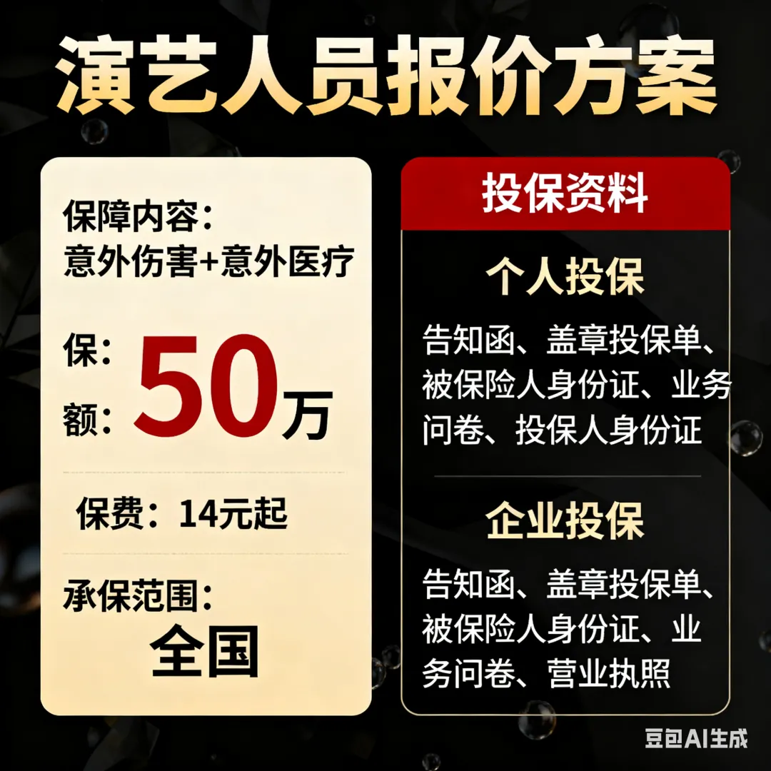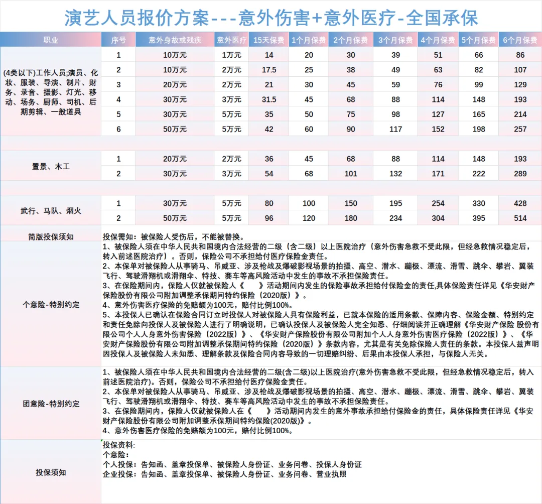 演艺人员报价方案---意外伤害+意外医疗-最高50万-14元起-全国承保 个人投保:告知函、盖章投保单、被保险人身份证、业务问卷、投保人身份证