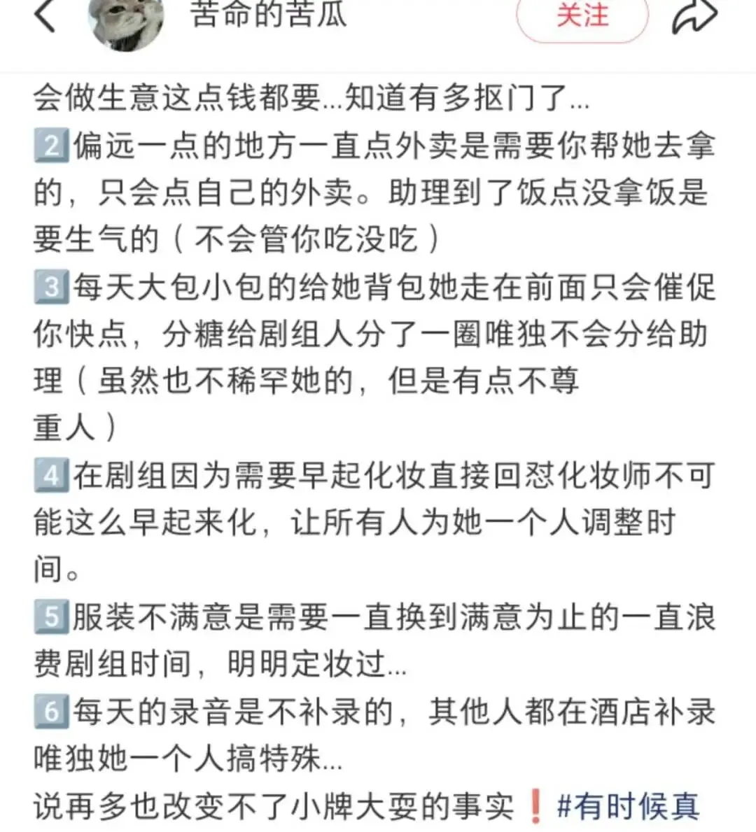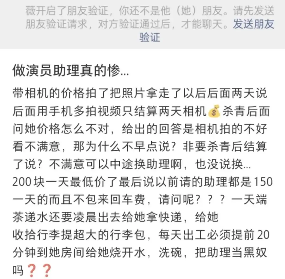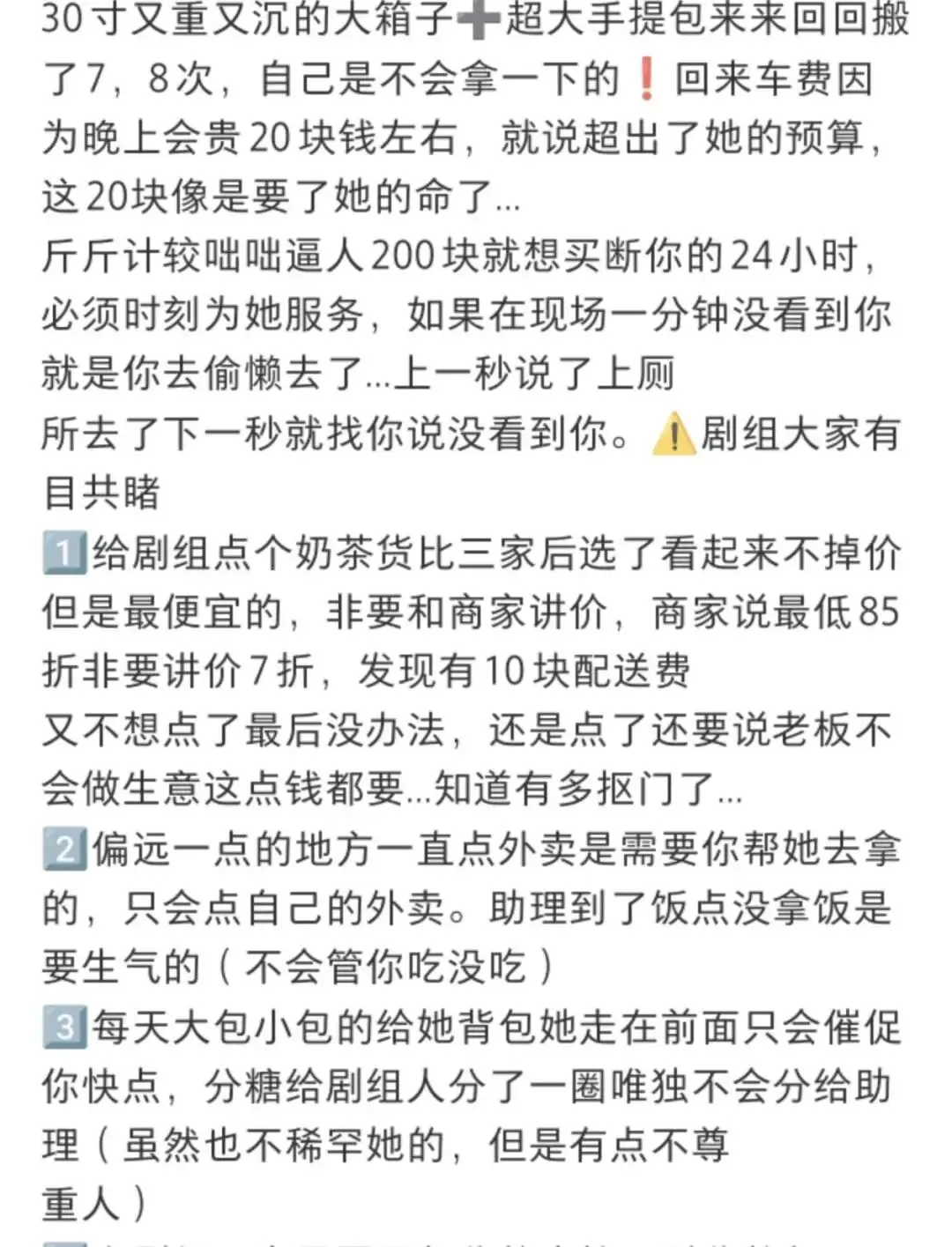 助理工作内容:必须时刻工作,要不然演员会Pua助理偷懒,比如上一秒交代上洗手间,下一秒抱怨找不到助理;每天出工必须提前 20 分钟到演员房间给她烧开水,洗碗;30 寸又重又沉的大箱子➕超大手提包来来回回搬了 7、8 次;凌晨还叫拿快递;拍演员相关物料。