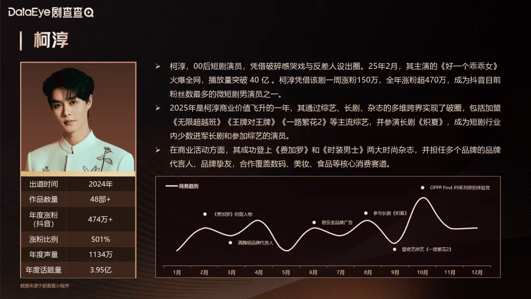 头部艺人无疑是微短剧行业的领军人物,他们凭借着超高的人气和强大的影响力,成为了行业的标杆。柯淳便是其中的佼佼者,他以一部《好一个乖乖女》成功出圈,该剧播放量破 40 亿,他也因此一周涨粉 150 万,全年抖音涨粉超 474 万,粉丝总量突破 592 万,在微短剧男演员中粉丝数独占鳌头。他的成功,不仅在于作品的热度,更在于他积极跨界,加盟《无限超越班》《王牌对王牌》等热门综艺,参演长剧《炽夏》《黎明前他会归来》,还登上多本时尚杂志封面,合作覆盖数码、美妆、食品等多个领域,实现了商业价值的全方位升级。