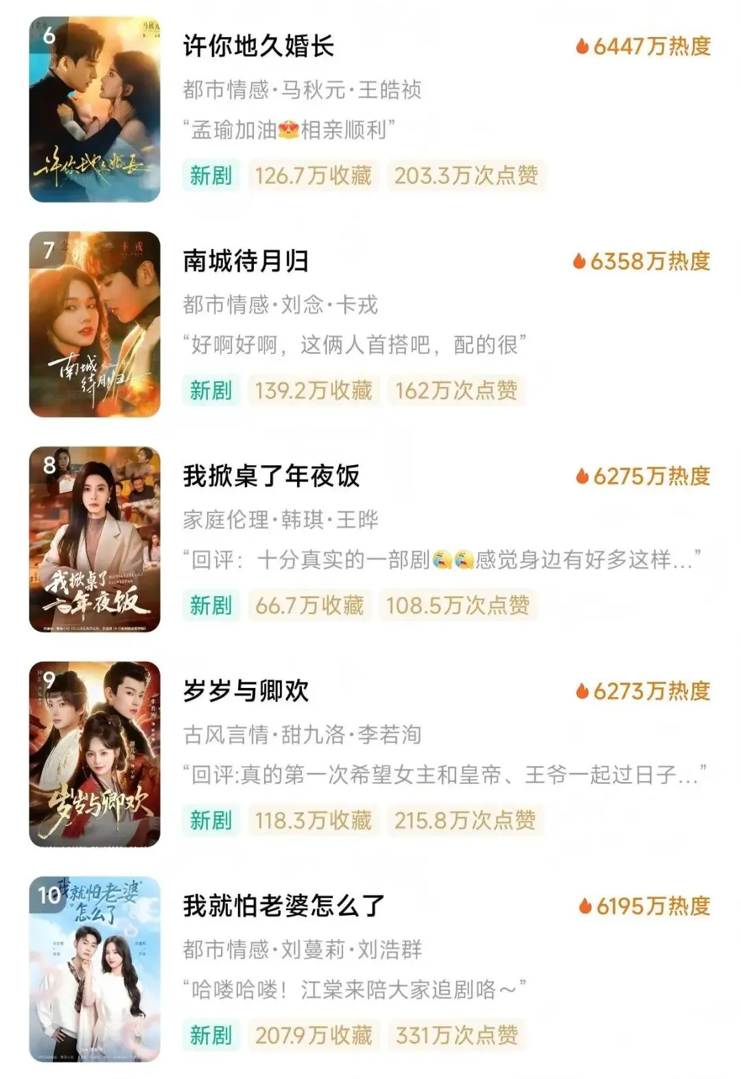 《南城待月归》 热度 6358 万,同样为都市情感类,由刘念、卡戎主演,已获 139.2 万收藏和 162 万次点赞。