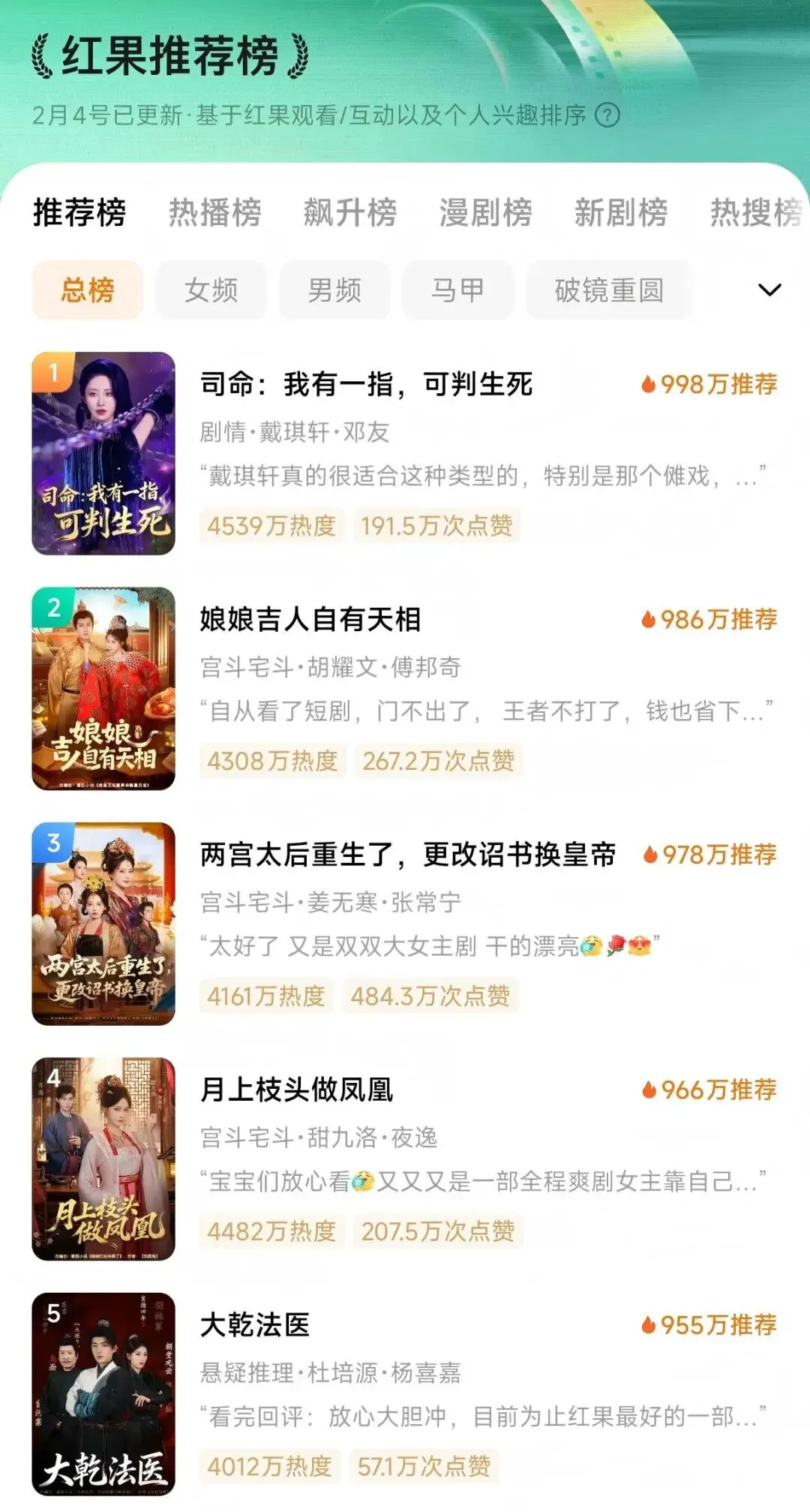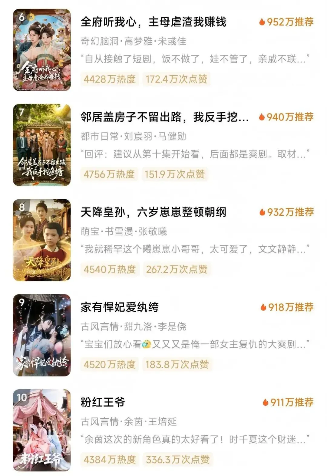 第四、五名分别为《我的女友是恶龙》和《重生拒当冤大头》,热度分别为 6758 万和 6735 万。前者是奇幻爱情题材,后者是种田经营类。