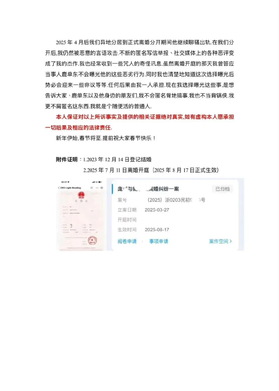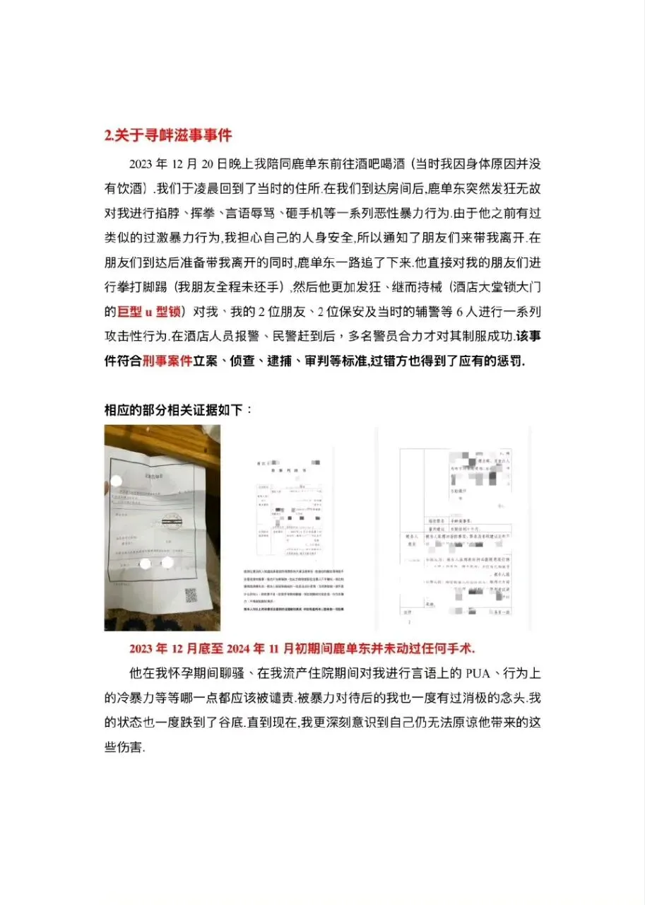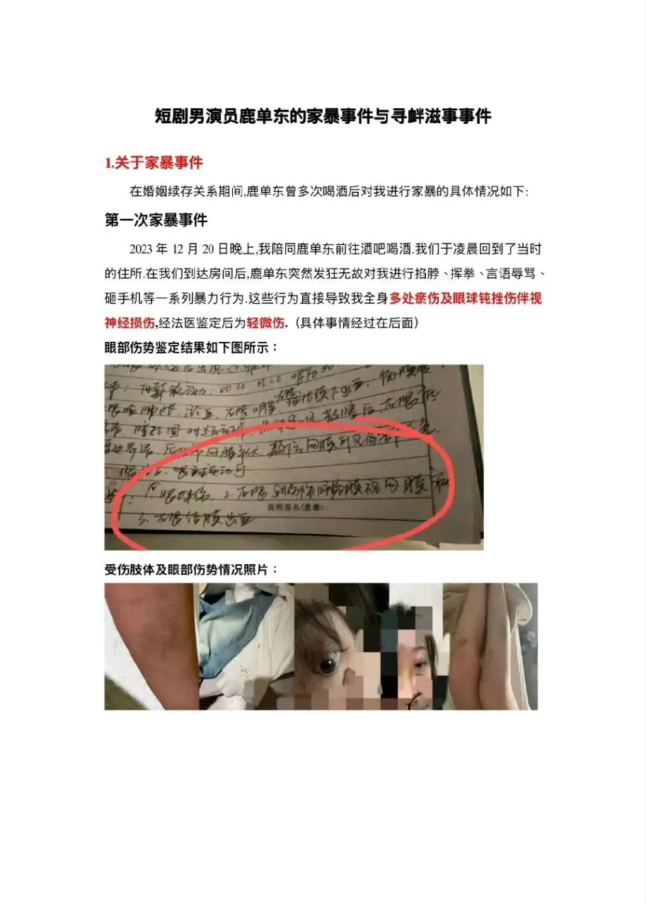 短剧演员鹿单东的前妻公开指控其家暴、出轨等行为:2023年12月酒后家暴致其轻微伤,还引发寻衅滋事案;2025年4月再次家暴,并被曝婚内与多人暧昧、给主播刷礼物。此外,他在女方孕期、流产期实施精神伤害,离婚后仍恶意抹黑,女方承诺所述事实及证据真实并愿担责。