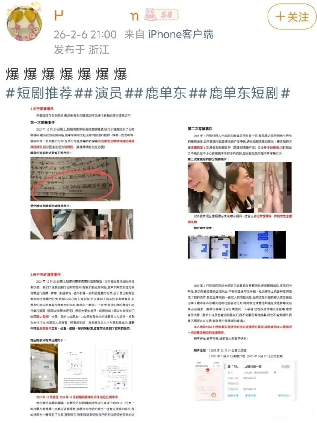 短剧演员鹿单东的前妻公开指控其家暴、出轨?