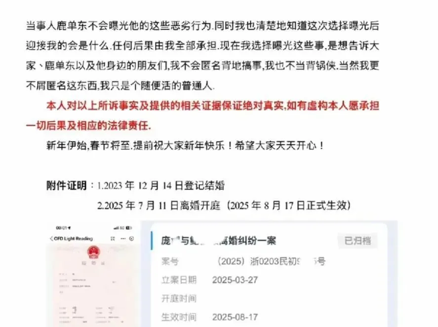 2025年8月17日,两人正式离婚。 但分开后,前妻仍收到匿名咒骂信,社交媒体上出现大量恶评。 她决定打破离婚时的保密约定,公开所有证据。 2月6日深夜,她发长文并附上九张铁证:伤情照片、司法记录、聊天截图、结婚证和离婚文件。 她承诺:“对所诉事实及证据真实性负责,愿承担一切法律责任。 ”