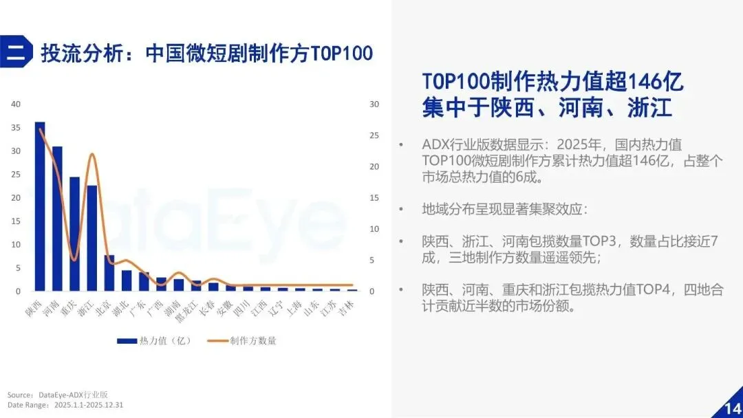 市场规模与海外布局更是实现双重突破,2025年国内微短剧市场规模稳步攀升,免费模式占据66.3%的市场份额,成为行业主流;海外赛道成绩斐然,1-8月海外市场总收入达15.25亿美元,同比暴涨194.9%,总下载量突破7.3亿次,同比增幅高达370.4%,中国微短剧成为文化出海的核心载体。同时,行业集聚效应显著,陕西、浙江、河南三地包揽全国微短剧制作方数量TOP3,占比接近7成,以西安为核心的西北产区、横店为核心的古装产区、郑州为核心的量产产区,共同构建起中国微短剧产业的核心版图,行业直接吸纳就业超69万人,带动全产业链就业突破200万,成为文化产业赋能经济发展的新标杆。
