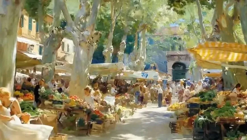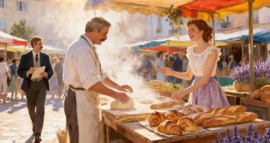 【场景】 普罗旺斯小镇广场,清晨的早市。阳光穿过彩色遮阳篷,空气中弥漫着刚出炉面包的麦香与薰衣草的气息。