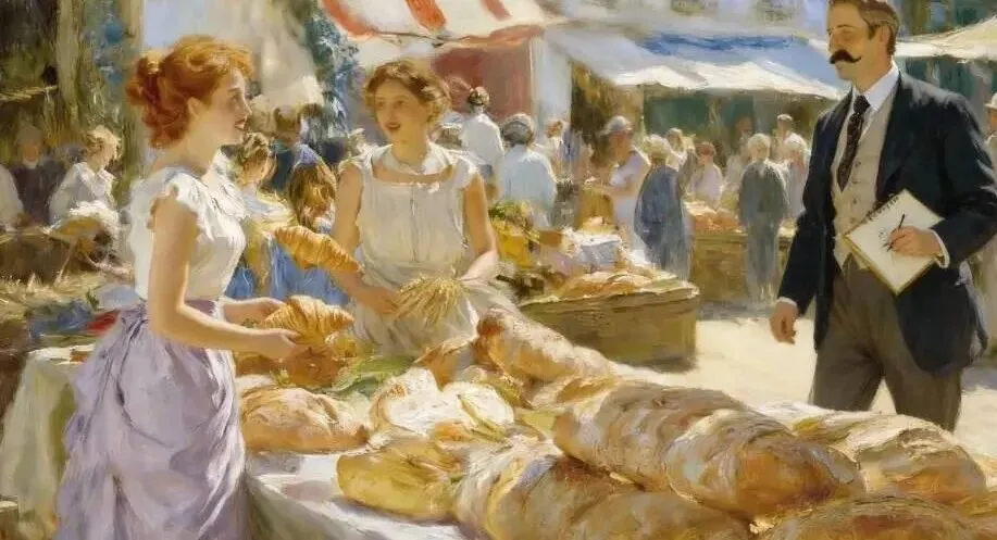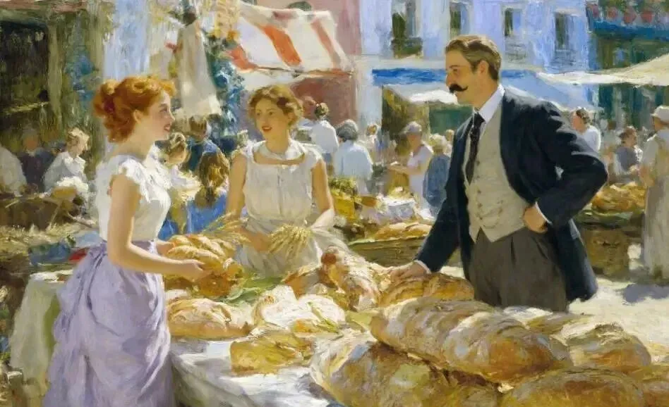 (加布里埃尔身着深色西装,手持速写本,穿过人群。他的目光被面包摊的香气和少女的身影吸引,脚步不自觉地停了下来。)