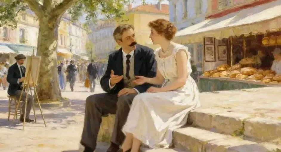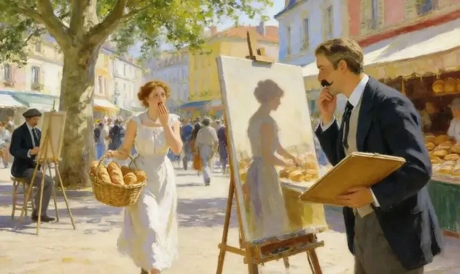 【场景】 一周后,小镇广场的午后。加布里埃尔在广场的梧桐树下支起画架,画布上是克莱尔在面包摊前忙碌的侧影。