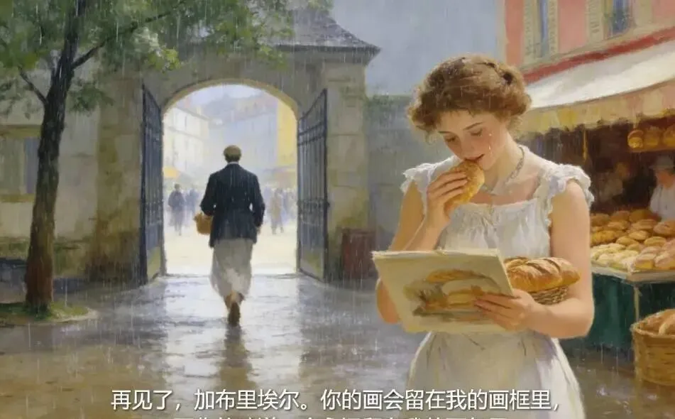 (镜头拉远,雨丝中的小镇广场渐渐模糊,只有面包摊的麦香,仿佛还在空气中飘荡,经久不散。)
