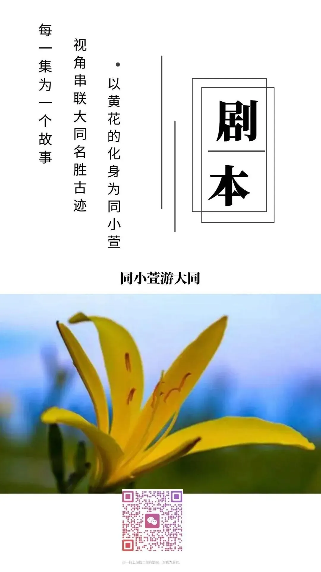 核心线索:以大同市“市花”——黄花的化身(同小萱)视角串联大同名胜古迹的历史文化及传说,每一集为一处景点典故,即一个故事。