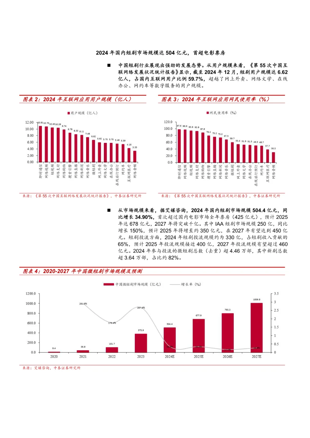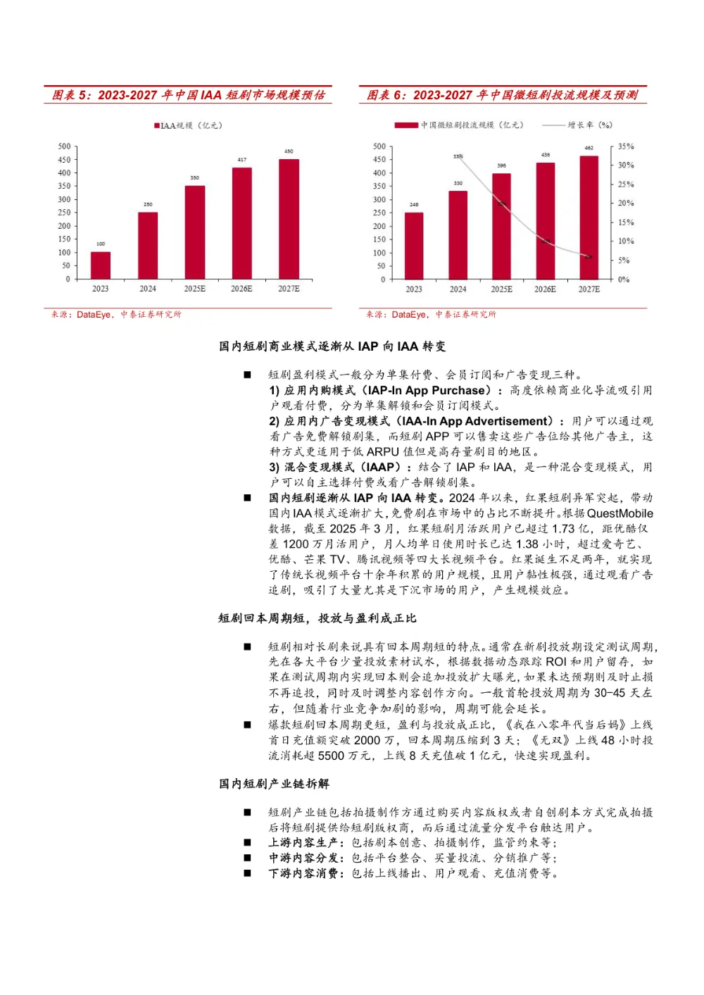 国内短剧商业模式逐渐从IAP(应用内购)向IAA(应用内广告变现)转变。红果短剧异军突起,截至2025年3月,月活跃用户已超过1.73亿,距优酷仅差1200万月活用户,月人均单日使用时长已达1.38小时,超过爱奇艺、优酷、芒果TV、腾讯视频等四大长视频平台。出海短剧的商业模式类似,分为IAA、IAP、IAAP三种模式,其中混合变现模式(IAAP)目前是主流模式,通常让用户免费试看前几集,后续剧集需要付费或者观看广告才能继续观看。IAA短剧市场规模与投流规模08 重点公司