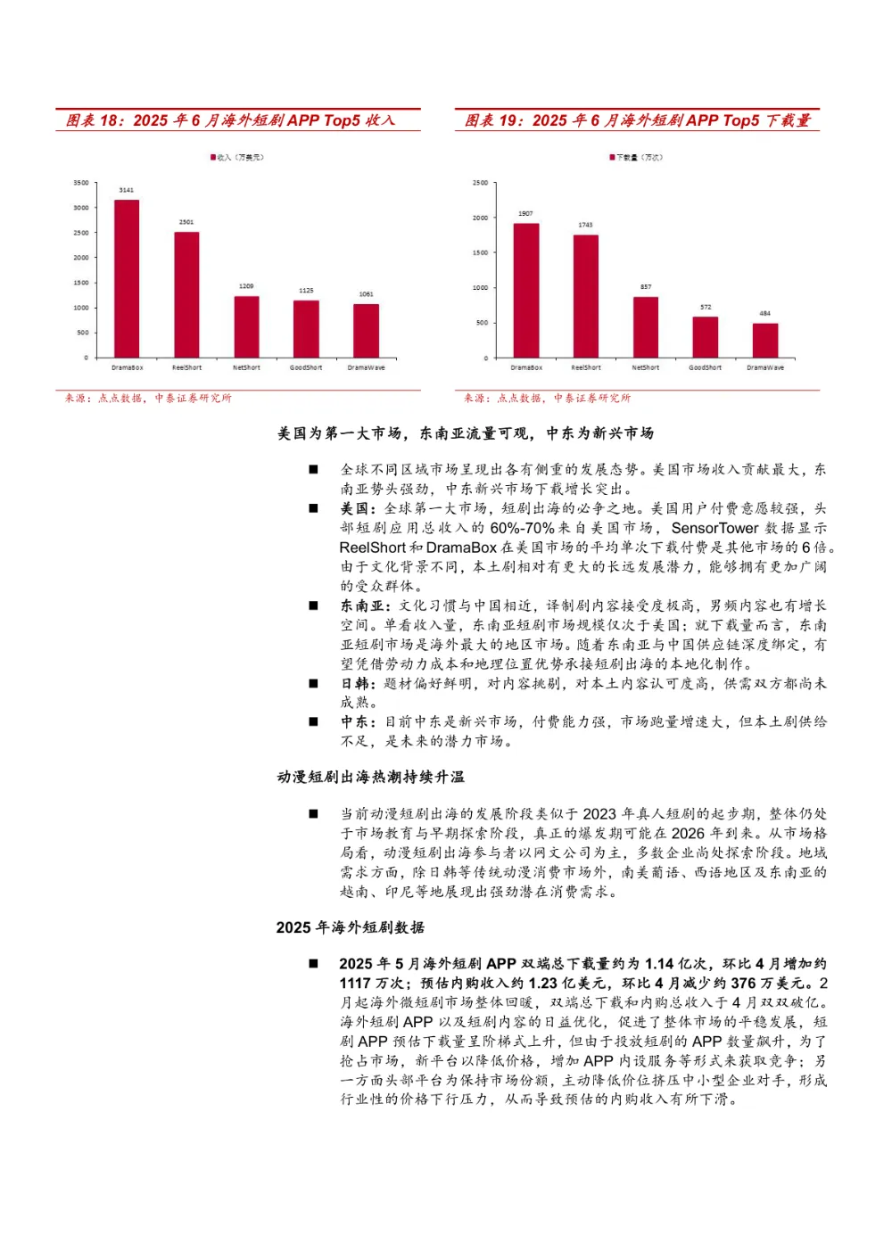 ReelShort和DramaBox凭借先发优势,成为短剧出海的双巨头。ReelShort:2022年8月上线,以本土化短剧为主,内容IP和拍摄均为本土化。依托本土化策略和稳定新剧产能,CMS2024年收入29亿元人民币,收入利润均实现倍数级增长。DramaBox:2023年4月上线,点众科技出品,以译制剧为主,背靠点众IP矩阵抢占市场份额。2024年收入达20145万美元,成为海外短剧收入最高的平台之一。截至2025年6月,DramaBox、ReelShort、ShortMax为TOP3短剧出海应用,在收入和下载量均显著领先,TOP3APP的2024年全球收入占比达到56.4%。头部短剧出海应用收入04 美国第一,东南亚崛起