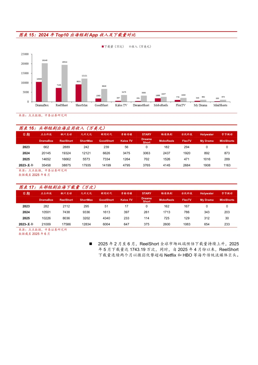 短剧的强势增长并非仅限于国内市场,海外短剧的爆发式增长正在成为中国文娱出海的新引擎。2022年,中文在线参股公司枫叶互动推出短剧APPReelShort,带领短剧扬帆出海。2023年各大头部玩家开始发力,2024年短剧出海进入高速发展期。《中国网络视听发展研究报告(2025)》指出,在海外视听类应用收入规模Top100中,中国应用有20个,其中微短剧类产品包揽8席,展现出极强的出海势能。海外短剧应用收入与下载量03 出海双雄