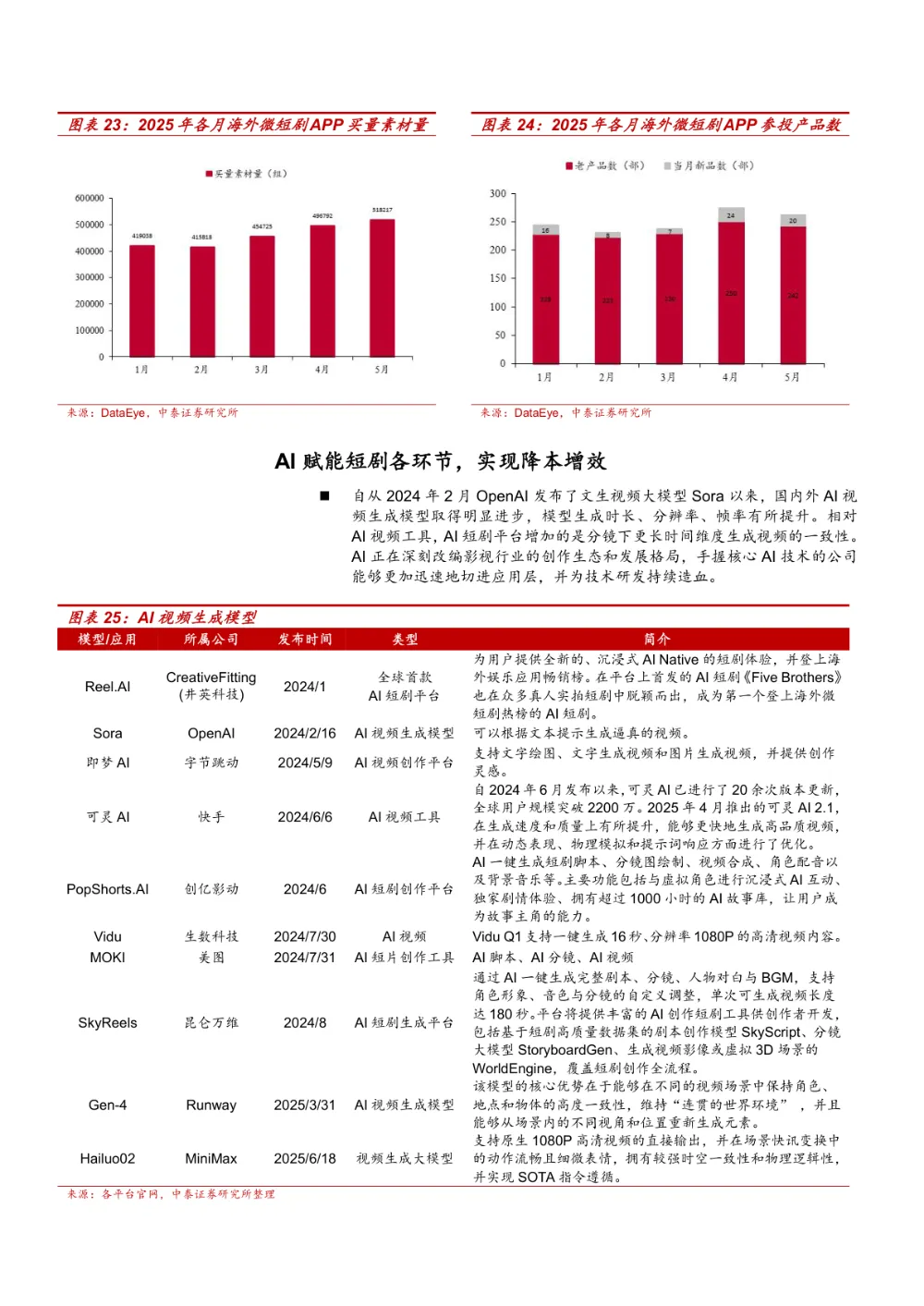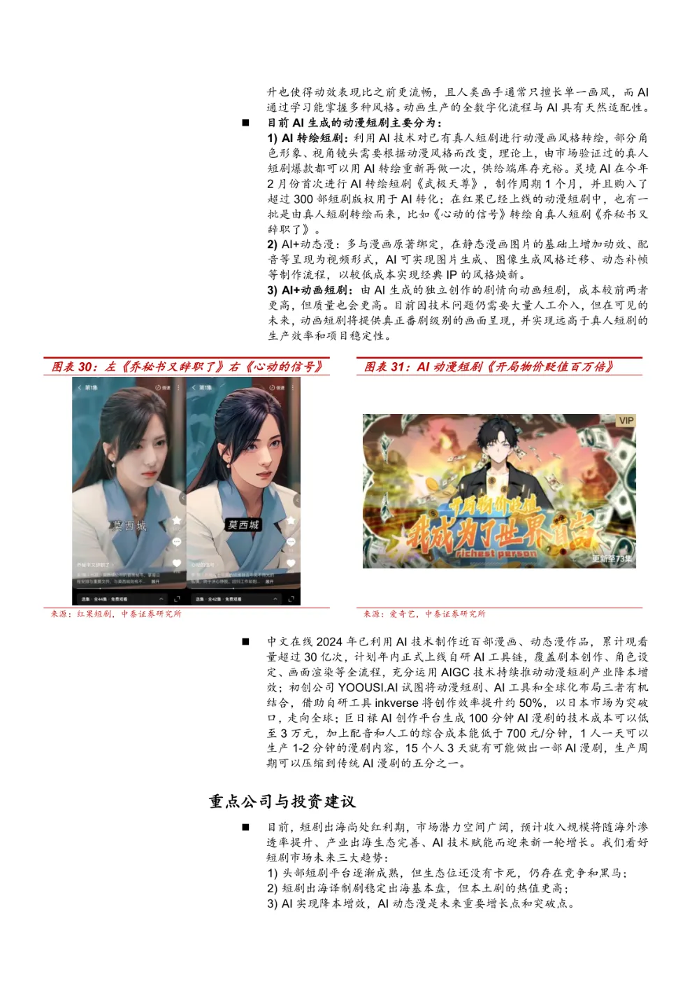 1.短剧出海赛道发展趋势,建议关注具有大量内容储备的影视及网文资源相关公司2.AI带来的短剧降本增效,建议关注有AI技术和应用的相关公司- 中文在线:ReelShort(持股49.24%)是短剧出海的开创者,2024年收入29亿元;推出海外AI创作平台XIAOYAO;2024年利用AI技术制作近百部漫画、动态漫,累计观看量超30亿次