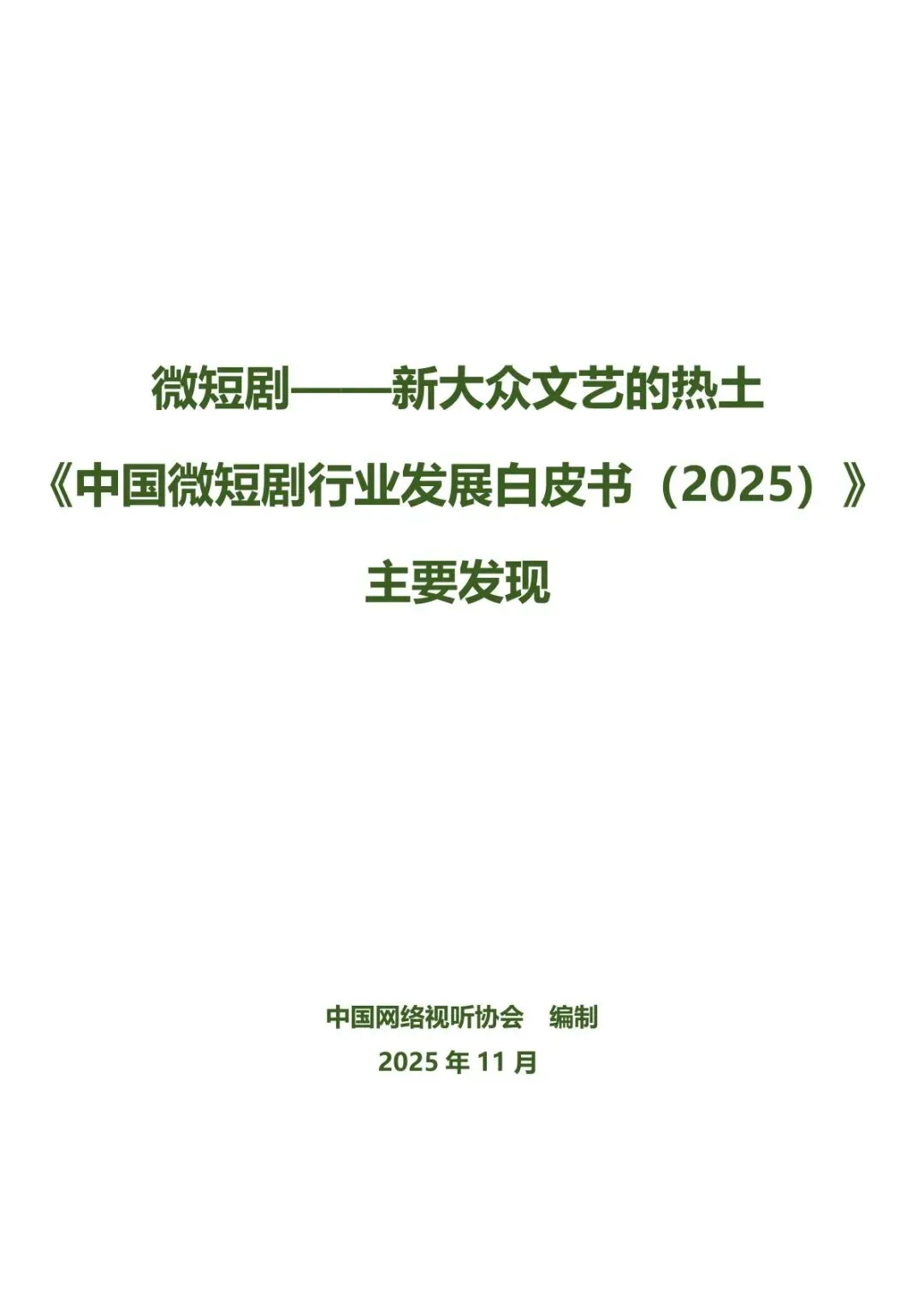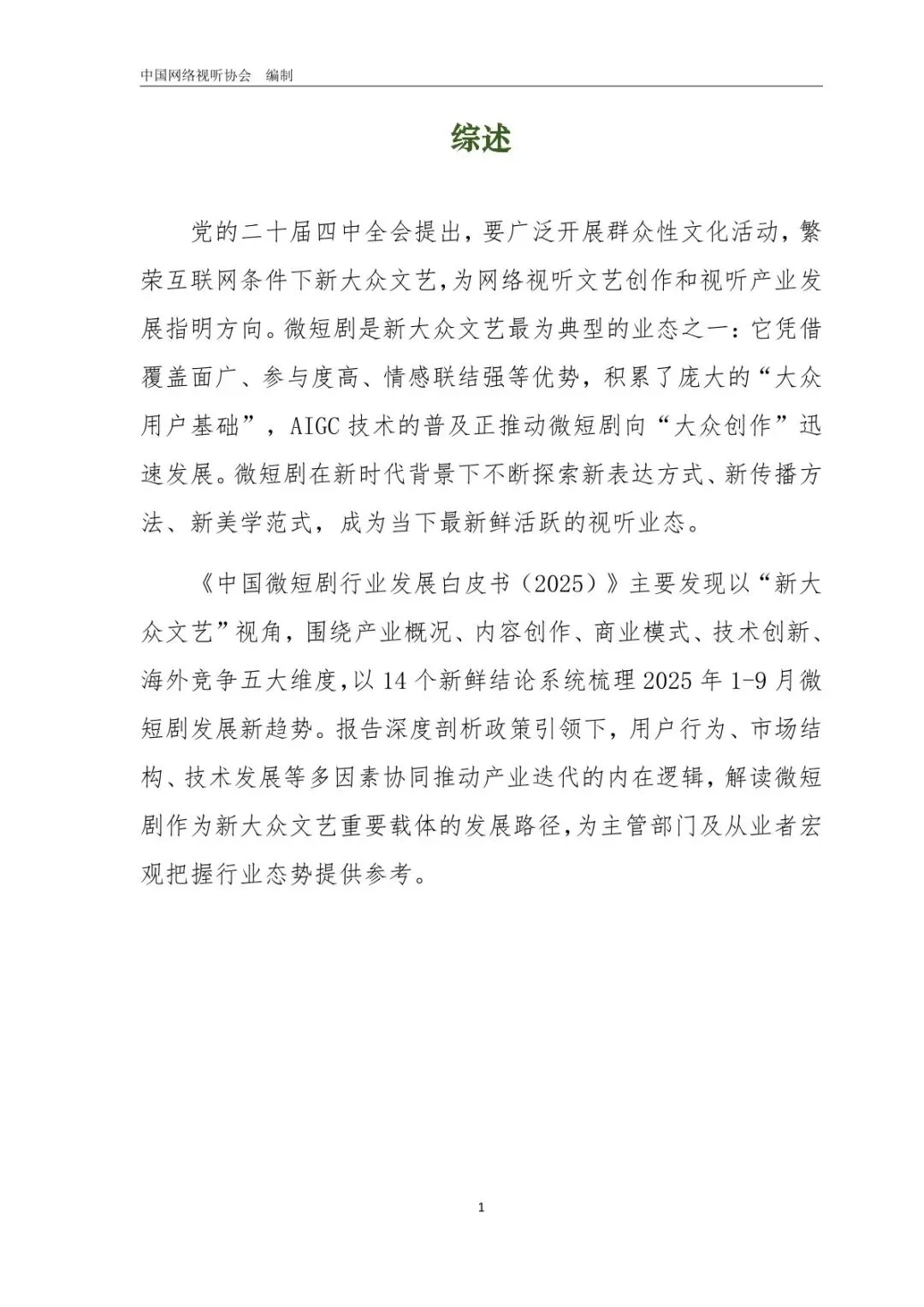 报告由中国网络视听协会编制,以 “新大众文艺” 为视角,从产业概况、内容创作、商业模式、技术创新、海外竞争五大维度,梳理 2025 年 1-9 月微短剧行业趋势。核心呈现行业向精品化转型、免费模式主导、AI 推动大众共创、出海增速迅猛的特征,揭示微短剧在政策引导、资本加持、技术赋能下的规模化发展路径。