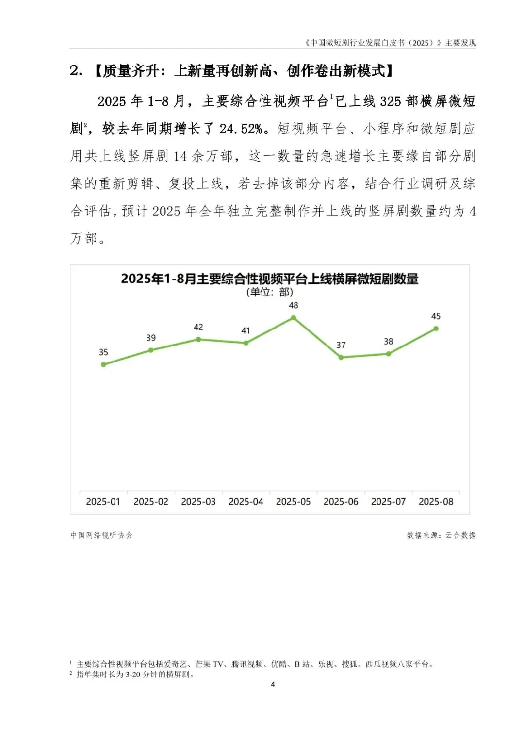 - 政策引导与精品化转型并行:国家广电总局通过 “两统筹两并重” 政策,推进专项治理与常态化监管,制定《微短剧管理办法》,实施 “微短剧 +” 行动计划;地方政府加大扶持,行业自律加强(如依法纳税倡议书)。内容层面,2025 年 1-8 月横屏微短剧上线 325 部(同比增 24.52%),竖屏剧约 4 万部(剔除重复上线),制作成本普涨至 40-70 万元 / 部,精品剧占比提升,形成 “头部化 + 冲量” 双策略。