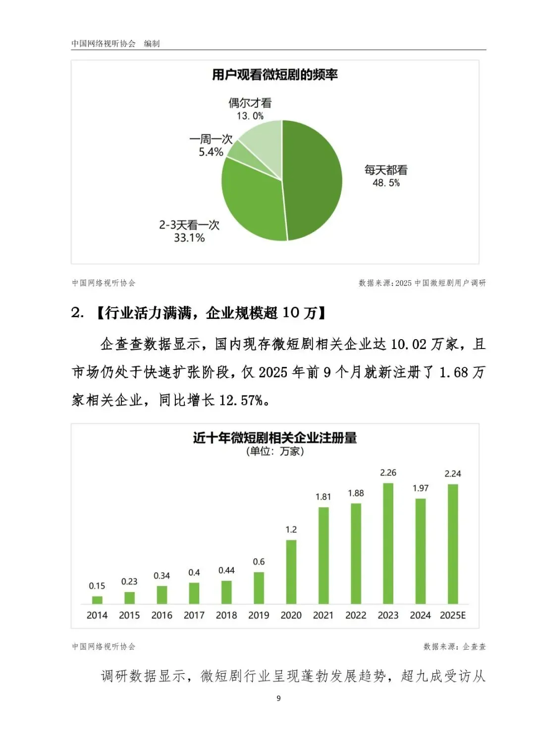 - 行业规模化发展,用户粘性极高:微短剧相关企业达 10.02 万家,2025 年前 9 月新注册 1.68 万家(同比增 12.57%),超九成企业收入稳定或增长。用户层面,人均单日使用时长 120.5 分钟(同比增幅 25.9%),近半数每天必看,59.8% 会重复观看喜欢的剧集。从业者信心强劲,87% 预判市场规模增长,37.7% 认为会显著增长,核心驱动因素为内容精品化、产业集群化、业态融合化。