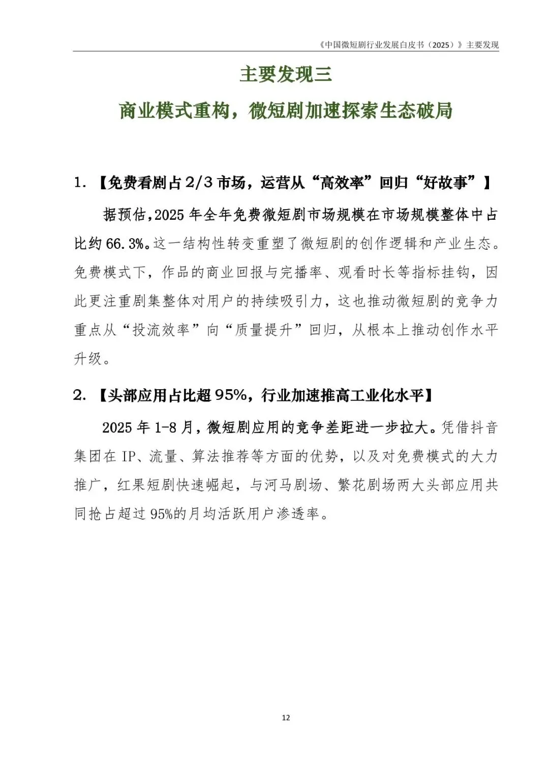- 商业模式重构,免费模式成主流:2025 年免费微短剧市场占比约 66.3%,推动行业竞争力从 “投流效率” 向 “质量提升” 回归,商业回报与完播率、观看时长挂钩。市场集中度高,红果短剧、河马剧场、繁花剧场占据超 95% 月活用户渗透率。头部机构通过并购、合资等整合资源,构建 “IP 孵化 - 制作 - 宣发” 全产业链闭环,部分自建拍摄基地与服化道仓库,降本增效并建立护城河。