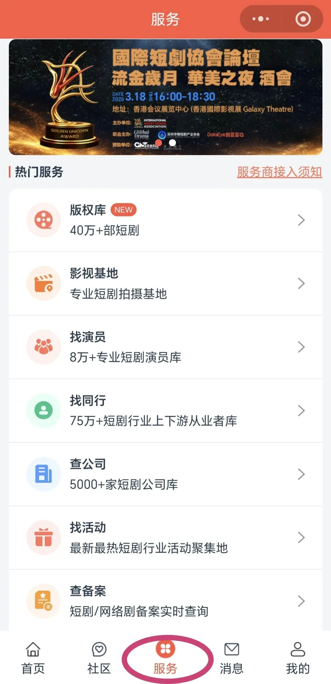 进入剧查查主界面后点击最下面的“服务”即可进入报名页面