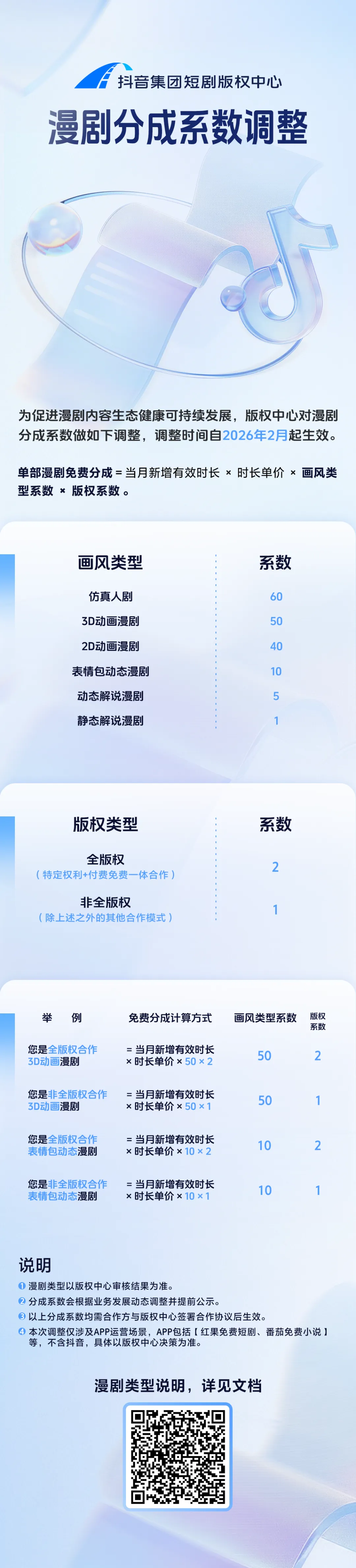 抖音集团短剧版权中心于2026年2月起对漫剧分成系数进行了调整。