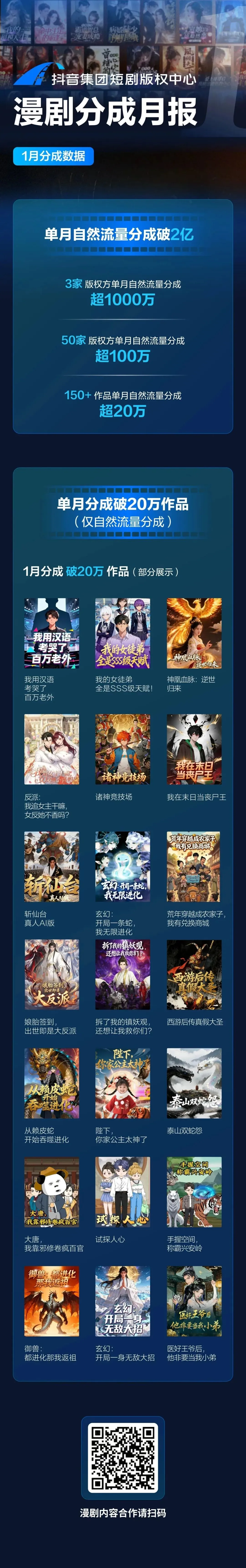 抖音发布1月漫剧分成月报:单月自然流分成破2亿