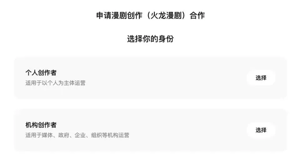 近期,火龙漫剧更新合作指导手册,开放“个人创作者”通道。其入驻流程显示,在选择账号注册主体时,身份信息可以选择“个人创作者”或者“机构创作者”,“个人创作者”需要通过手机完成实名认证。