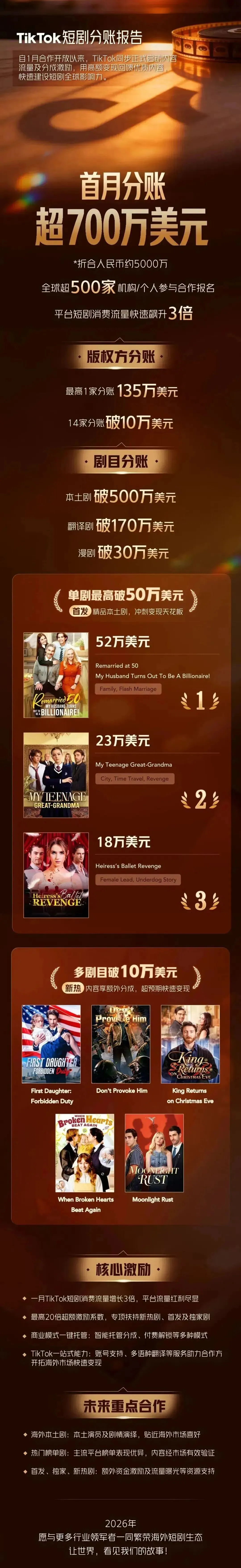 近日,TikTok发布首月分成报告,自短剧合作开放以来,平台凭借高额变现回报与流量激励吸引了超过500家机构及个人报名合作,单月总额直接突破700万美元(约人民币5000万元),同时,平台短剧消费规模也在数周内实现3倍增长。