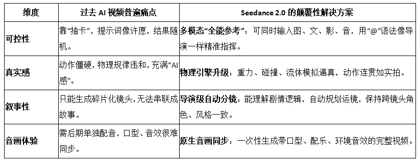 Seedance 2.0的震撼,源于它一次性解决了AI视频长期以来的四大顽疾:“不可控”、“不真实”、“无叙事”、“音画割裂”。这并非简单的参数提升,而是一次从底层逻辑到用户体验的全面革新。罗列表格对比如下: