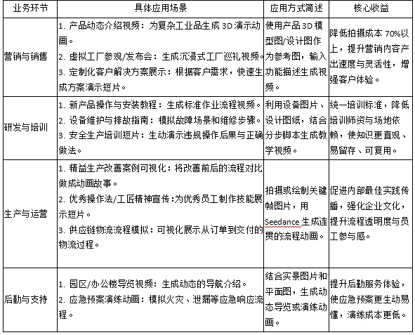 我们可以开始尝试沿着制造业的价值流,在营销、研发、生产、运营等环节,找到Seedance 2.0的用武之地。下表将具体场景、应用方式与核心收益一一对应比较,虽然为初步的思考,但可以按此作为起点,不断细化和调整。
