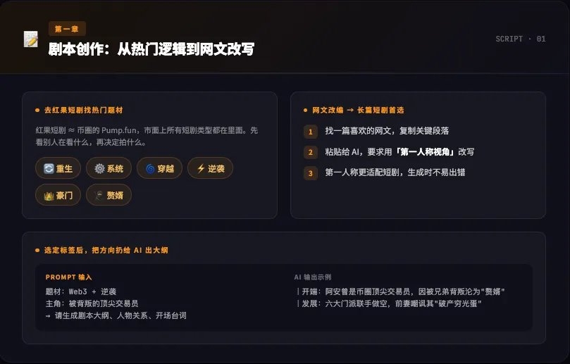 网文天然就是好的短剧素材——人物关系清晰,情节密集,逻辑顺畅。你要做的只是「格式转换」:把网文的文字,变成短剧的分镜台词。