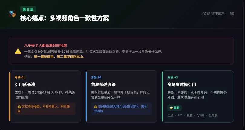 AI 每次生成视频都是独立的,它不记得上一段里角色长什么样。所以同一个角色,不同片段里可能发型变了、脸型变了,甚至整个人都换了。