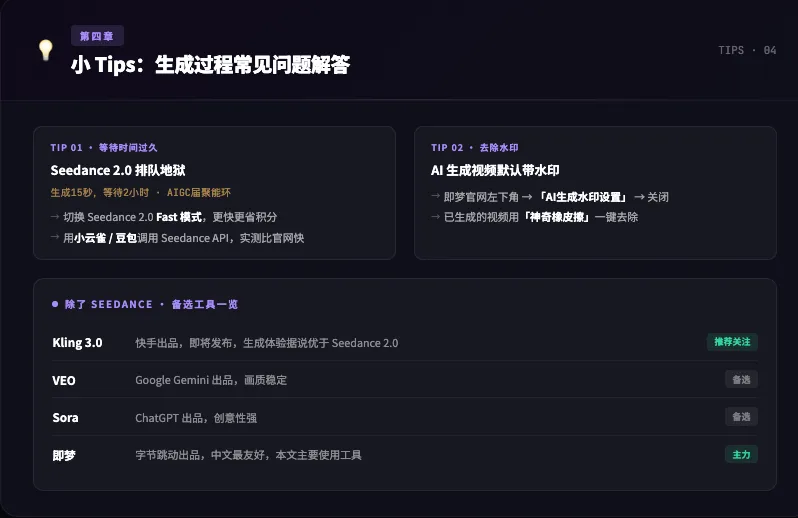 所以除了 Seedance 之外,还推荐尝试 Gemini 的 VEO 、ChatGPT 的 Sora、快手的 Kling ,听说 Kling 3.0 即将出来了,生成体验比 Seedance 2.0 更好。