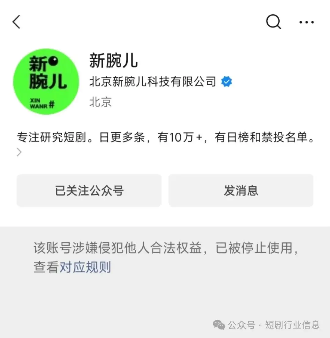 今日(5月16日),因涉嫌侵犯他人合法权益,短剧行业自媒体“新腕儿”微信订阅号被封。