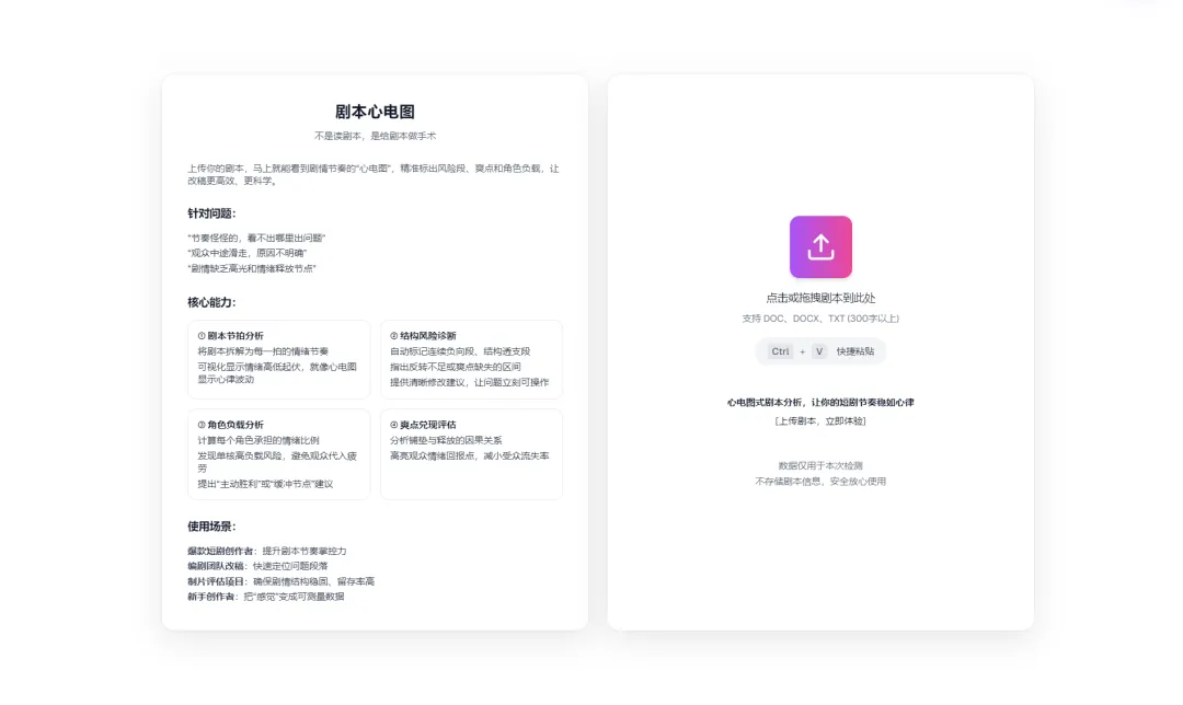 短剧工程有2个主要功能——剧本AI检测和剧本心电图,页面简介,操作方便。剧本 AI 检测系统依托文本结构模式识别、语言生成概率分析与语言稳定性建模技术打造,针对中文叙事文本开展了专项训练。与通用检测模型不同,该系统更适配情节类内容的表达形式,可支持短剧剧本、小说章节、网络文学内容的检测,平台审核、编辑筛选、版权风控、内容合规辅助判断等场景均能适用。