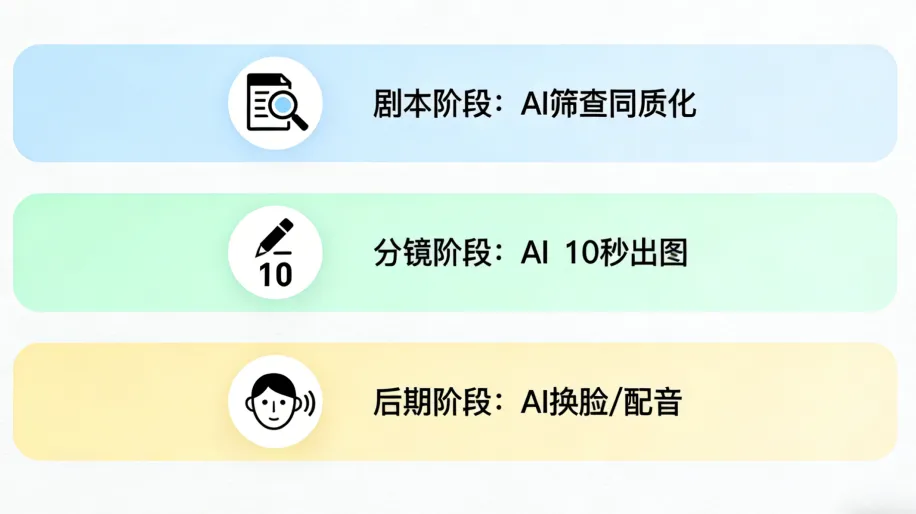 剧本阶段用AI筛查同质化情节,分镜阶段10秒出概念图,后期用AI换脸、配音解决难题。