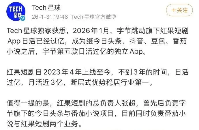 红果短剧自2023年8月上线,2025年下半年月活就快速达到2.45亿,超越B站、优酷;2026年1月,有媒体报道红果短剧日活突破1亿大关,成为字节旗下第五款日活过亿的独立App。掌握行业90%以上的供给后,红果的分账激励政策有任何风吹草动,都会在整个短剧行业掀起连锁反应。