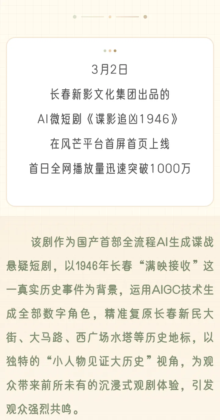 >行业动态丨吉产AI微短剧《谍影追凶1946》上线首日全网播放量破千万