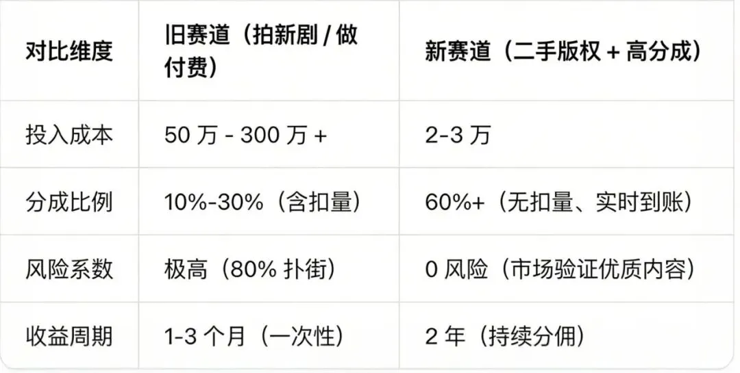 - 窗口期:新赛道红利期只剩 6-12 个月,等大部分人反应过来,版权价格翻倍、分成比例下调,现在入局 = 抢占 “低价红利期”;