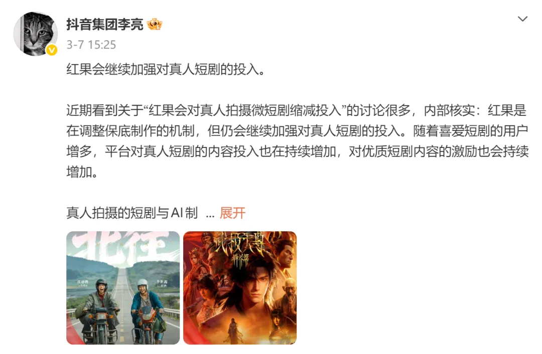 AI崛起是否会取代真人短剧?李亮给出了明确的“互补论”: