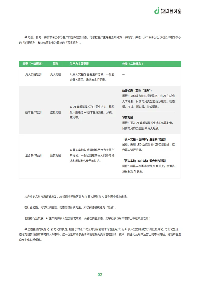 报告开篇明义,将AI短剧定义为一种技术深度参与生产的虚拟短剧形态。其核心市场明确区分为两大方向: