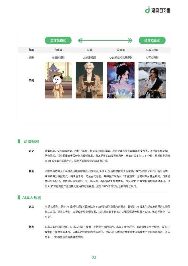 AI漫剧:以动漫风格为核心,服务于泛二次元垂直用户。其下进一步细分为表情包漫剧(沙雕漫)、动态漫画、AI漫剧、小说漫解(解说漫)、游戏漫和互动漫剧等多种形态。