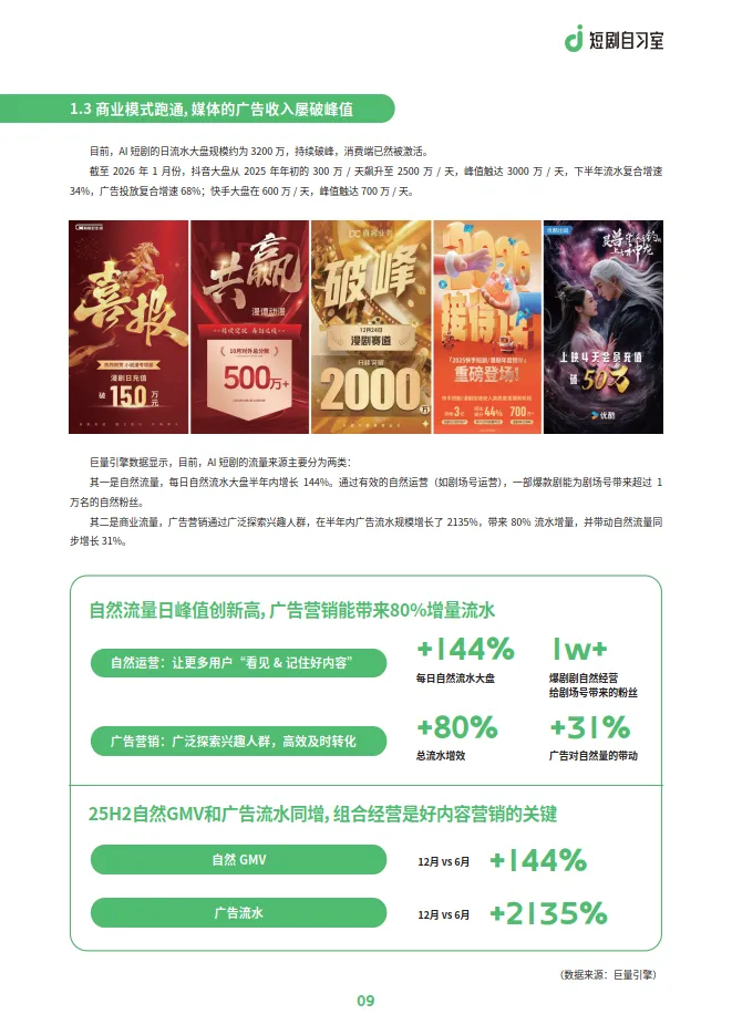 消费端需求被点燃:用户规模高速增长(复合增速约12%),核心用户画像为年轻男性(男性占比73%,40岁以下用户占比85%)。抖音端全年累计播放量超757亿,商业模式跑通,日流水大盘规模约3200万,广告投流成为重要增长引擎。