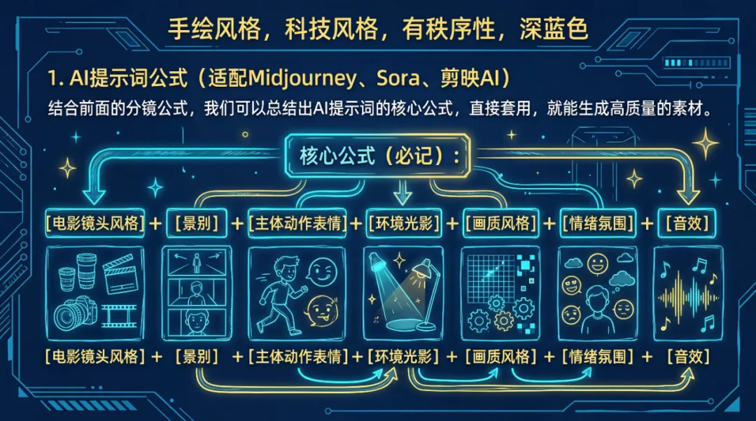 提示词编写规律: 永远先写“镜头”,再写“环境”,最后写“声音” 。AI或摄影师需要先知道“看哪里”,才能理解“听什么”,才能精准把握情绪氛围。避坑提醒: 不要写“拍得好看一点”“情绪到位一点”这种模糊的提示词,越具体越好——景别、动作、光影、音效,每一个细节都写清楚,拍出来的效果才会贴合你的预期。全流程实操建议(避坑指南)——新手必看,少走1年弯路很多新手,剧本写得不错,分镜也写得详细,但拍出来的短剧还是不火,问题出在“全流程的细节”上。短剧制作不是随性创作,而是一场精密计算的艺术,每一个环节都不能出错。下面这份“全流程避坑指南”,结合10+新手失败案例,帮你避开所有常见坑,提升播放量和完播率。新手最容易犯的错:“我喜欢这个题材,我就拍这个题材”。但实际上,短剧的流量密码,是“观众喜欢”,而不是“你喜欢”。核心公式(必记): 热门题材 + 痛点共鸣 + 差异化设定① 热门题材 : 打开各大短剧平台(抖音、快手、腾讯微视),看“热门榜单”,当前最火的题材的是“重生复仇”“霸总甜宠”“职场逆袭”“古装爽剧”,这些题材自带流量,新手优先选择,不要去拍冷门题材(比如文艺、悬疑推理),流量会很差。② 痛点共鸣 : 结合观众的日常痛点,比如“被婆婆欺负”“被上司压榨”“被伴侣背叛”“努力得不到认可”,这些痛点能让观众瞬间代入,比如你拍“重生复仇”,结合“婆媳矛盾”,比单纯的重生复仇,共鸣感更强。③ 差异化设定 : 热门题材竞争激烈,必须加“差异化”,才能脱颖而出。比如大家都拍“重生复仇”,你就加“身份互换”(女主重生到反派身上,反向复仇);大家都拍“霸总甜宠”,你就加“女主反撩霸总”(打破常规霸总追女主的设定)。失败案例: 新手拍了一部“文艺短剧”,讲女主的日常感悟,没有冲突、没有爽点,虽然画面好看,但播放量只有几百——因为观众看短剧,是为了“宣泄情绪”,不是为了“看文艺感悟”。短剧的剪辑节奏,直接决定完播率——如果剪辑拖沓,哪怕剧本再好,观众也会划走。记住:短剧的每一秒,都要用来“传递信息、制造冲突”。核心公式(必记): 高频画面切换 + 音效卡点 + 剔除无效信息① 画面切换频率 : 每一帧画面不要超过3秒,哪怕是一个眼神的停留,也要配合音效,不要让画面“静止”。比如女主哭,3秒内必须切换镜头(从特写切换到中景,或者切换到反派的画面),避免观众视觉疲劳。② 音效卡点 : 剪辑时,让画面切换和音效同步,增强节奏感。比如女主反击反派时,画面切换的瞬间,配合“耳光声”“鼓点声”,爽感会翻倍;比如反转场景,画面切换时,配合“悬疑音效”,增强紧张感。③ 无效信息剔除 : 任何没有“冲突、情绪、信息”的画面,全部剪掉。比如“女主走路的画面”“女主吃饭的画面”“空镜头”,如果没有推动剧情、没有传递情绪,就不要留,哪怕画面再好看。某爆款短剧《重生后我虐渣上瘾》,每集1分30秒,画面切换频率平均2秒一次,没有任何无效镜头。比如女主揭穿反派阴谋的片段,15秒内切换了8个镜头(女主特写→反派特写→证据特写→宾客反应→女主冷笑→反派慌乱→女主台词→结尾悬念),配合鼓点音效,节奏紧凑,完播率高达85%。3. 避坑指南:为什么你的剧不火?(3大核心坑,必避)结合10+新手失败案例,总结出3个最常见的坑,避开这些坑,你的短剧播放量至少提升10倍。失败案例: 新手拍一部“职场逆袭”短剧,开篇用1分钟交代女主的背景(出身普通、努力工作、被上司压榨),然后才进入冲突(上司泼咖啡羞辱女主)。结果前1分钟,观众大量划走,完播率极低。避坑建议: 直接跳过铺垫,开篇就进入冲突。女主的背景、过往经历,不需要专门交代,在剧情中穿插一句旁白、一个镜头,就能让观众明白,比如女主反击上司时,加一句旁白:“我忍了三年,今天,我不再忍了”,观众就知道女主被压榨了很久。失败案例: 新手写的台词:“我认为,你这样的行为,严重伤害了我的情感,我无法原谅你。” 太书面、太生硬,观众没有代入感,觉得“不真实”。避坑建议: 台词必须口语化、短平快,像吵架一样真实。把上面的台词改成:“你这样做,太过分了!我这辈子都不会原谅你!” 更接地气,更有情绪张力。技巧: 写完台词后,自己念一遍,如果觉得“别扭”“不像是日常说话”,就修改,直到念起来自然、顺口。失败案例: 新手拍的短剧,剧情中规中矩,没有标志性的动作、台词,观众看完后,完全记不住这部剧讲了什么,自然不会转发、追更。避坑建议: 每一集必须有一个“记忆点”——可以是一句标志性台词,也可以是一个标志性动作。示例:标志性台词:女主每次反击前,都会说:“欺负我,你还不够格!”;示例:标志性动作:女主每次复仇后,都会整理一下自己的袖口;示例:标志性道具:女主一直带着一支玉簪,这支玉簪是她的护身符,也是她的复仇信物。真实案例: 某爆款短剧《总裁的契约妻》,女主每次拒绝男主时,都会说:“总裁,我们只是契约关系,不要越界。” 这句话成为了观众的“记忆点”,很多观众会在评论区刷这句话,带动了剧的热度。在AI时代,不用再花费大量时间写分镜、拍素材,只要把我们前面讲的公式,转化为AI提示词(Prompt),就能让AI帮你生成分镜、拍摄素材,甚至生成完整的短剧片段,效率提升10倍。1. AI提示词公式(适配Midjourney、Sora、剪映AI)结合前面的分镜公式,我们可