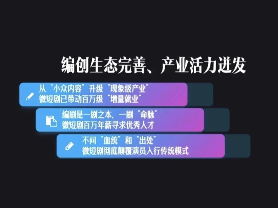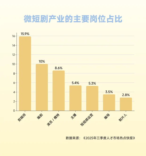 从“小众内容”升级成为“现象级产业”微短剧已带动百万级增量就业。2025年12月5日,首届微短剧编剧创享会于上海举办,中国网络视听协会秘书长助理、微短剧工委会常务副秘书长余力现场发布《2025微短剧行业生态洞察报告》报告显示,微短剧行业主要生产环节已带动133.3 万个就业岗位,2025年前三季度相关人才需求同比增长26%,抢人“白热化”,主编月薪最高、头部编剧年薪百万。